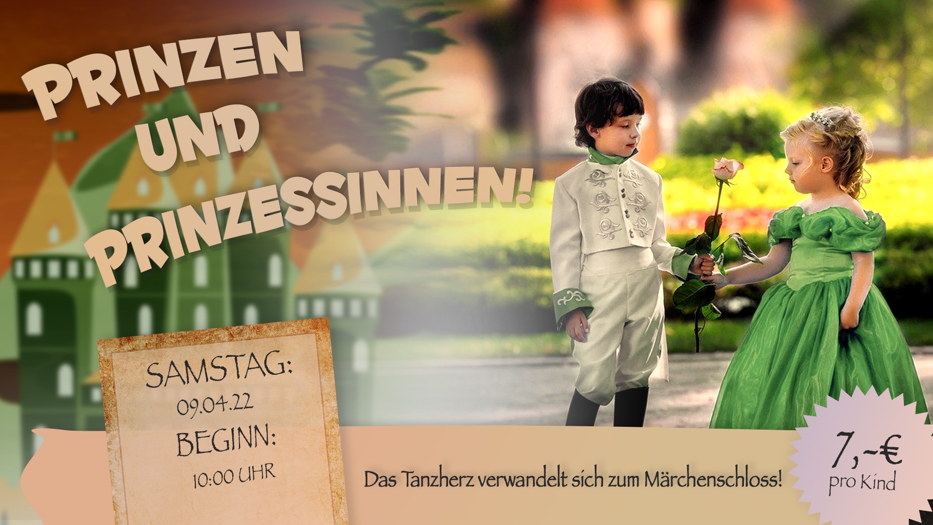 Am Samstag, den 09.04 verwandelt sich das Tanzherz in ein Märchenschloss und lädt alle Kinder zum „Prinzen und Prinzessinnen – Tag“ ein.
